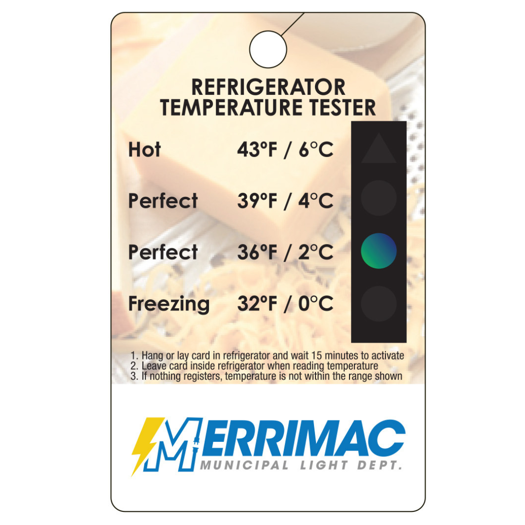 Great Health and Safety piece. If the electricity goes out, this piece will let you know when you should become concerned about possible spoiled food. It can hang in the refrigerator, can be taped or simply lay flat. Custom design doesn't affect the production time or the cost (as long as artwork is supplied). Stock crystal strip is included on the front.